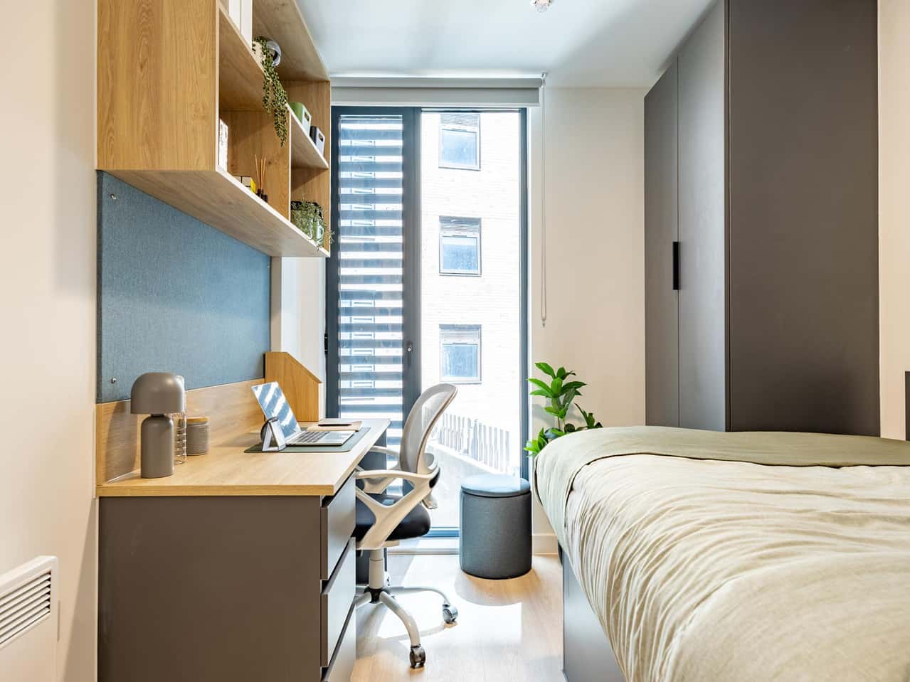 The Classic En-suite offers comfortable living on the lower ground and ground floors. This well-designed room sizing around 13.0m² - 15.9m² includes a cosy bed, study desk with chair, ample storage, and a private washroom, ensuring both comfort and privacy. The shared kitchen, complete with all essential appliances, a TV lounge, sofa area, and dining space, creates the perfect setting for socialising and unwinding with housemates. Book your Classic En-suite today and enjoy a vibrant community living experience!