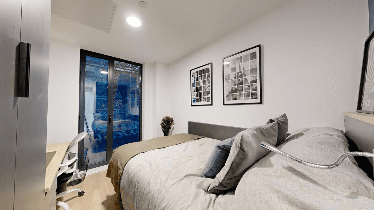 Enjoy modern student living in the Premium Plus En-suite, located on floors 1-6 with room sizes ranging from 13.4m² - 14.6m². This room includes a cosy bed, study desk with chair, ample storage, and a private en-suite washroom. The shared kitchen, complete with essential appliances, a dining area, a TV lounge, and a comfortable sofa space, provides the perfect blend of social and private living. Looking for a premium en-suite in a prime location? Book now!