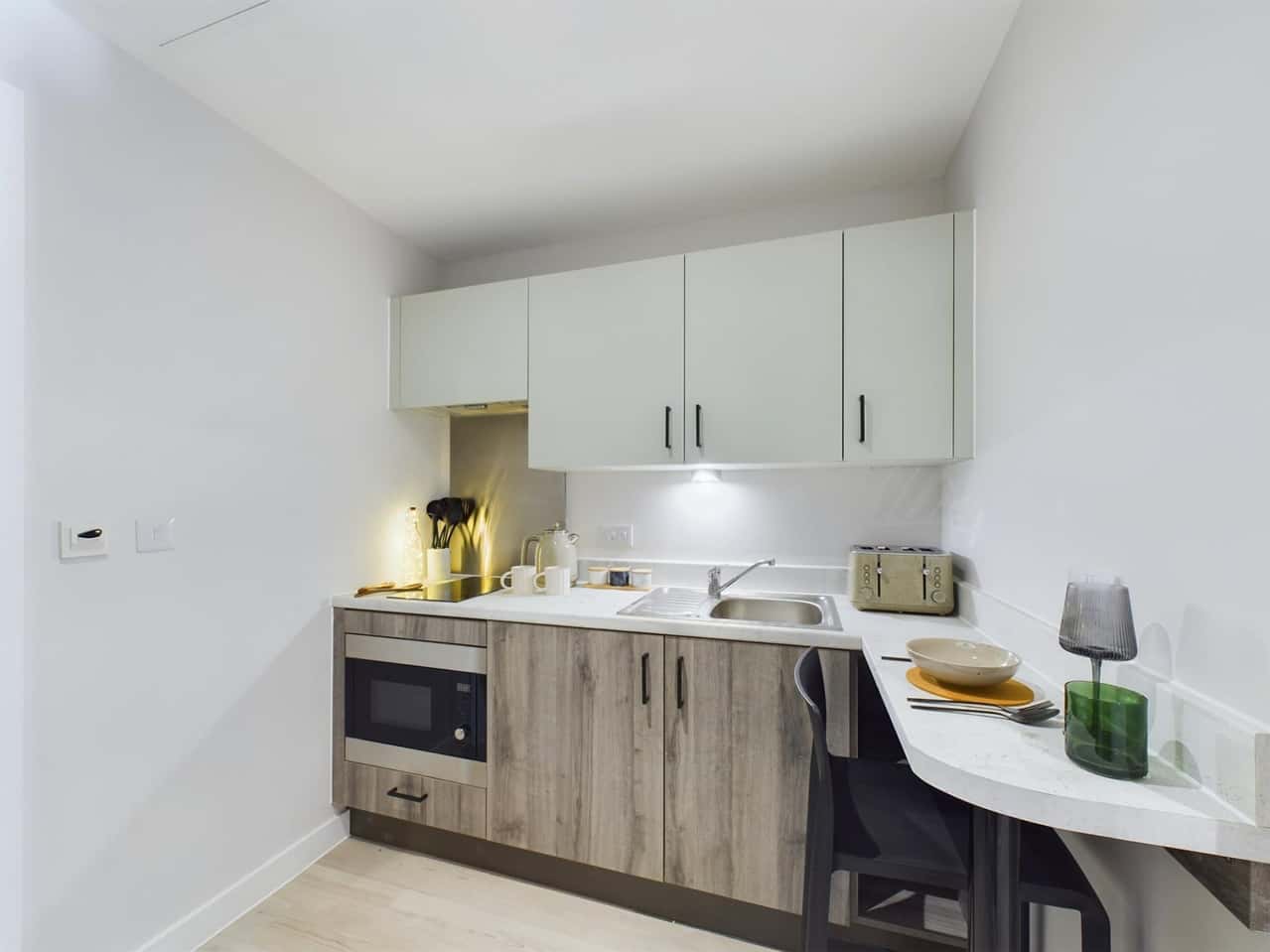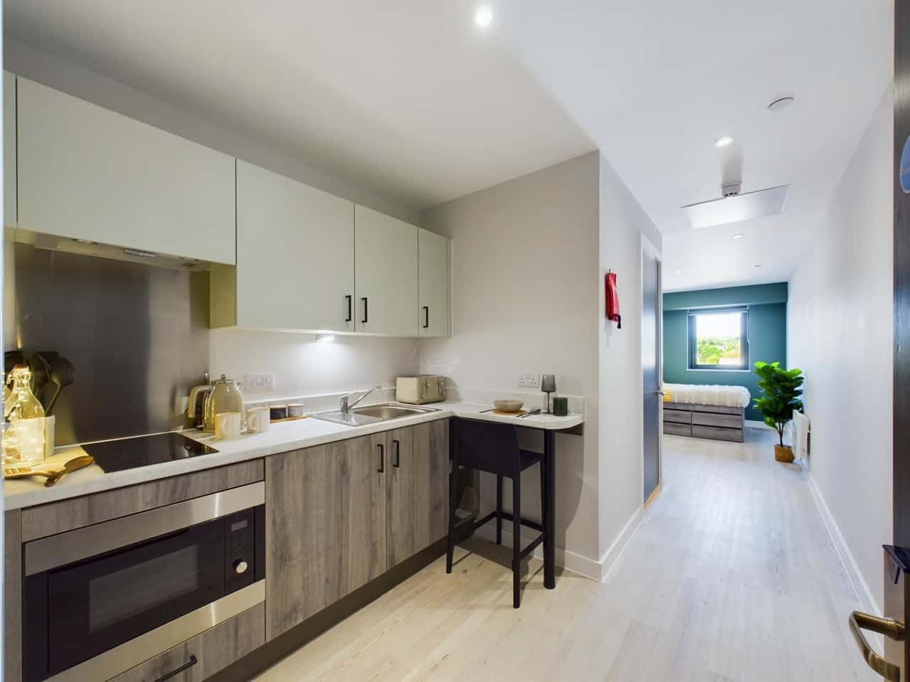 The Diamond Studio offers comfortable living spaces with sizes ranging from 20m² to 21m². Each studio features a 3/4 size bed with under-bed storage and a kitchenette with a 2-ring hob with an extractor and a breakfast bar. The en-suite bathroom includes a shower and WC, and the studio also has amenities such as a full-length mirror, integrated fridge with freezer compartment, microwave oven, pinboard, stool, study desk with drawer space and chair, and wardrobe. The studio provides ample space for students to study, relax, and unwind. Hurry up and book your studio today!