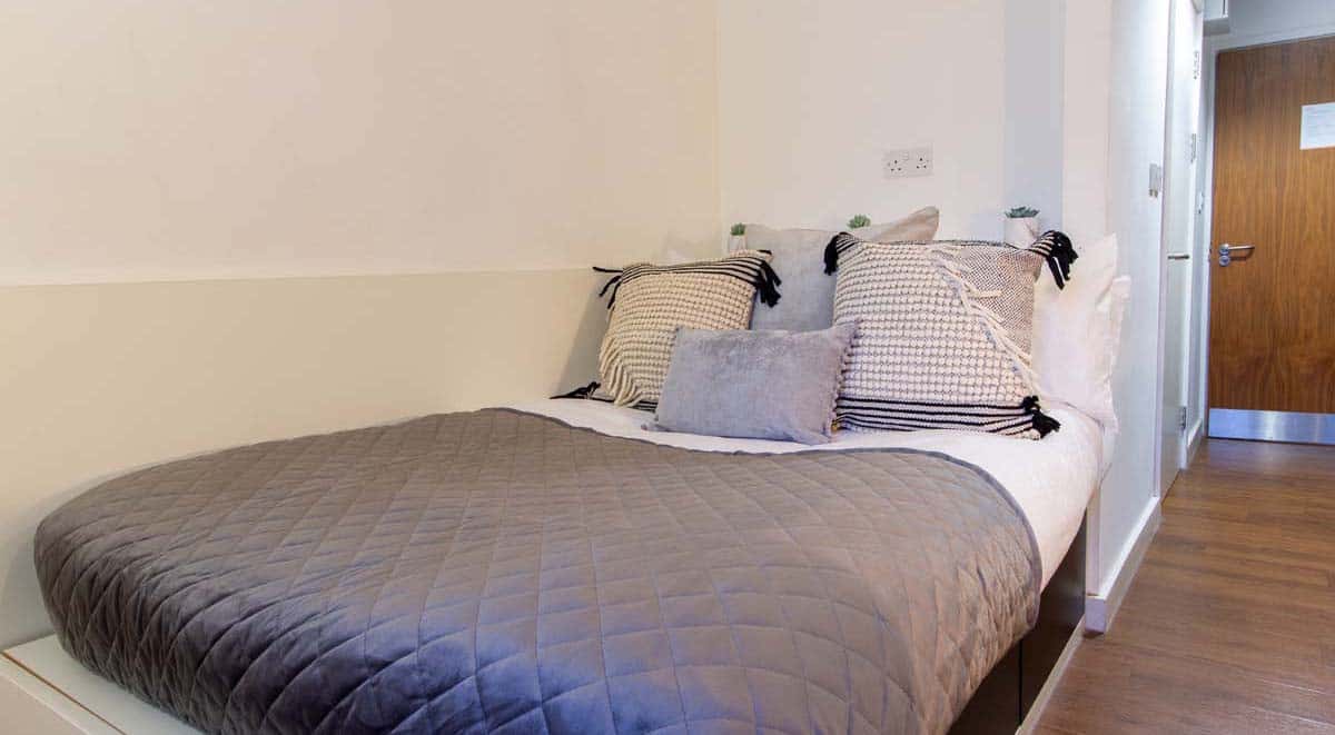 Stylish studio measuring around 14-18m², ¾ fixed bed with under bed storage, kitchenette, en-suite shower room, study area, double wardrobe, and up to 100mbps WIFI throughout. Please contact the property for Bed Size.