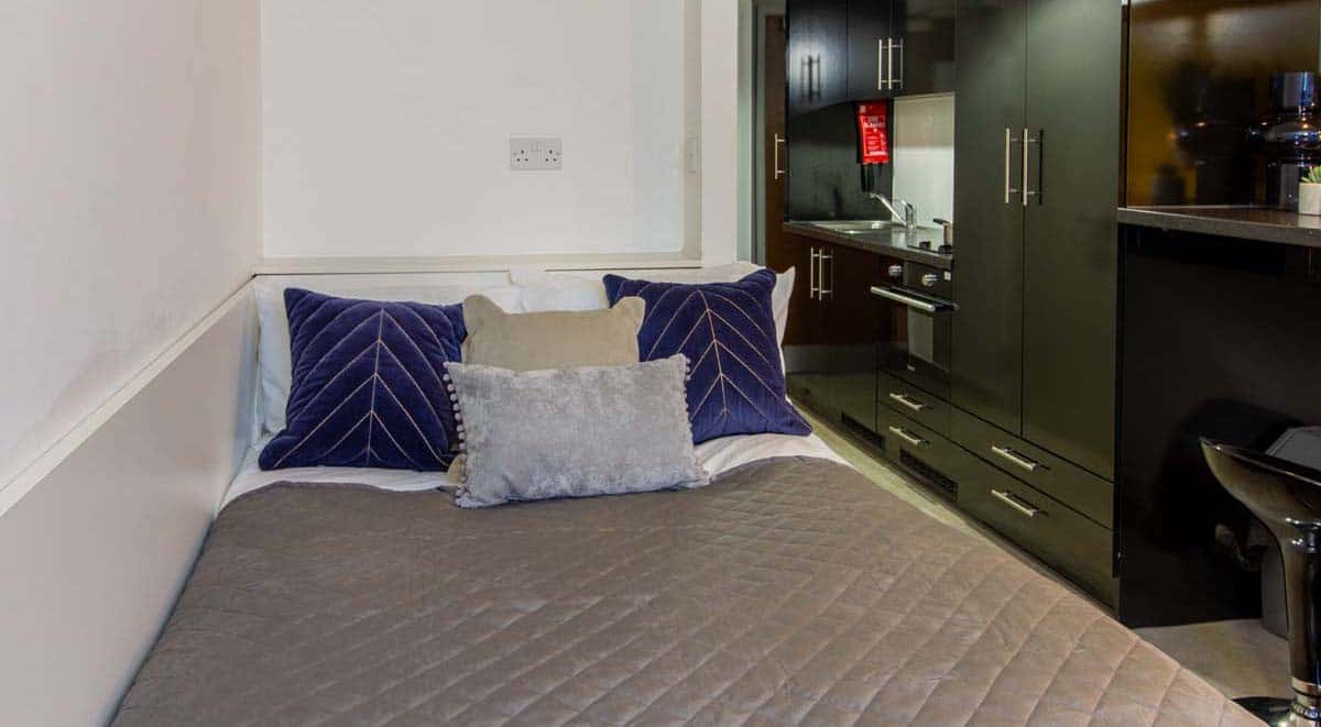 Gold Studio measuring around 18-19m², comes complete with a fixed bed with under bed storage, kitchenette, en-suite shower room, study area, double wardrobe, and up to 100mbps WIFI throughout.