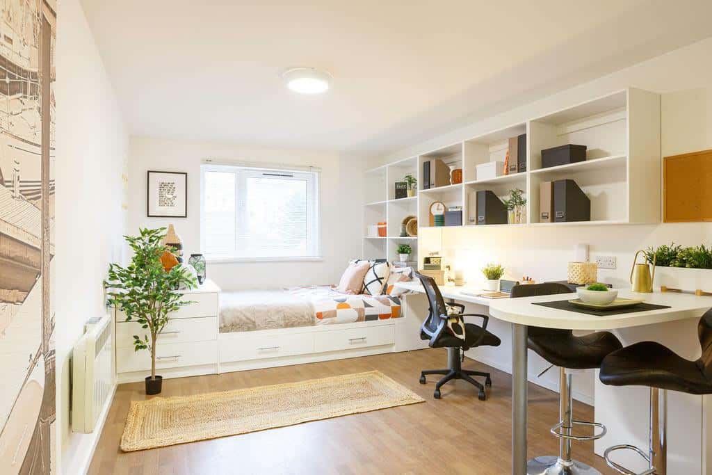 The studio is modern and airy with an open-plan kitchen and front room area to relax in. Enjoy a restful night’s sleep on a double bed with underbed storage. Your private en-suite shower room includes a heated towel rail. The in-room kitchen features a 2-ring hob, a combi-grill microwave, and a fridge with a freezer section. Stay organised with the pinboard and make use of the built-in desks, under-desk power points, and lights. The studio also includes a desk chair, a breakfast bar with two stools, and a large wardrobe with a full-length mirror. Blinds provide privacy, and electric heaters that can be controlled by tenants.