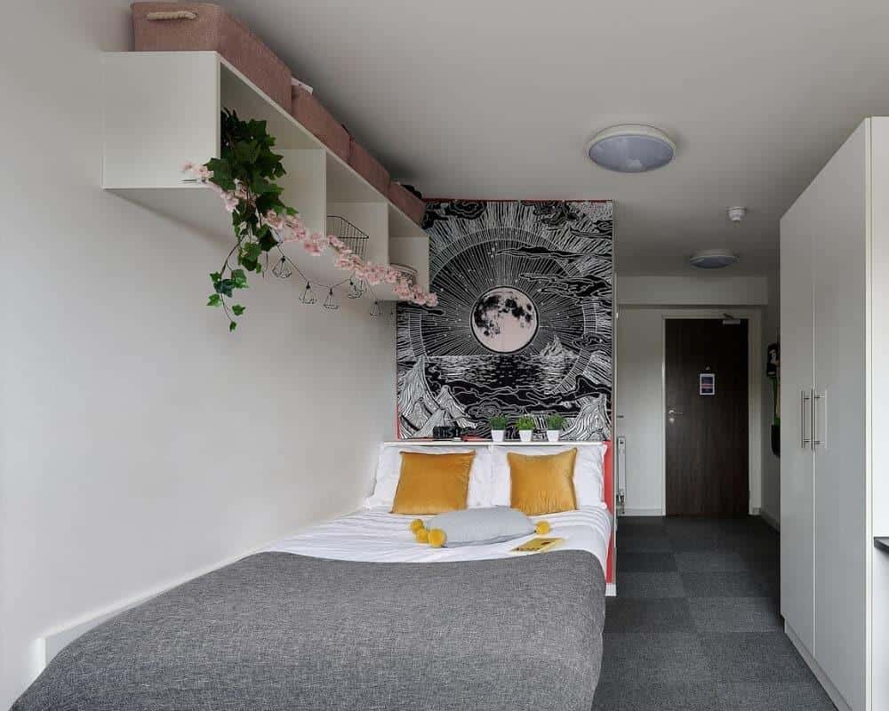 Our Premium Plus Enuite rooms are situated a little higher in the building and will ensure you have more privacy and more peace and quiet than in a regular booking, making them ideal for group bookings or for anyone in their third year who’s likely to be hitting the books hard. As a bonus, you’ll also have a lovely view of the Ocean City during your stay, at least when it’s dry! Offering everything you need for a great student experience. It has a 3/4 double bed, wardrobe, bedside shelf, coat hooks, and under-bed storage. The spacious desk, chair, bookshelves, and noticeboard make studying easy. Central heating keeps you cosy, and your private en-suite washroom adds convenience. You’ll also have access to a shared lounge with a sofa and TV, and a well-equipped shared kitchen with essential appliances, along with a dining table and chairs.