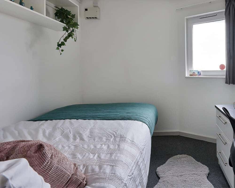 The Deluxe Ensuite is your perfect student space, blending comfort and convenience. Inside, you'll find a cozy 3/4 double bed, a spacious desk for studying, and plenty of storage for your belongings. Stay warm with central heating and enjoy the privacy of your own en-suite bathroom. Beyond your room, relax in the shared lounge with a TV or cook up a meal in the well-equipped kitchen. It's everything you need for a successful and enjoyable student experience. Our Deluxe Enuite rooms are situated a little higher in the building and will ensure you have more privacy and more peace and quiet than in a regular booking, making them ideal for group bookings or for anyone in their third year who’s likely to be hitting the books hard.