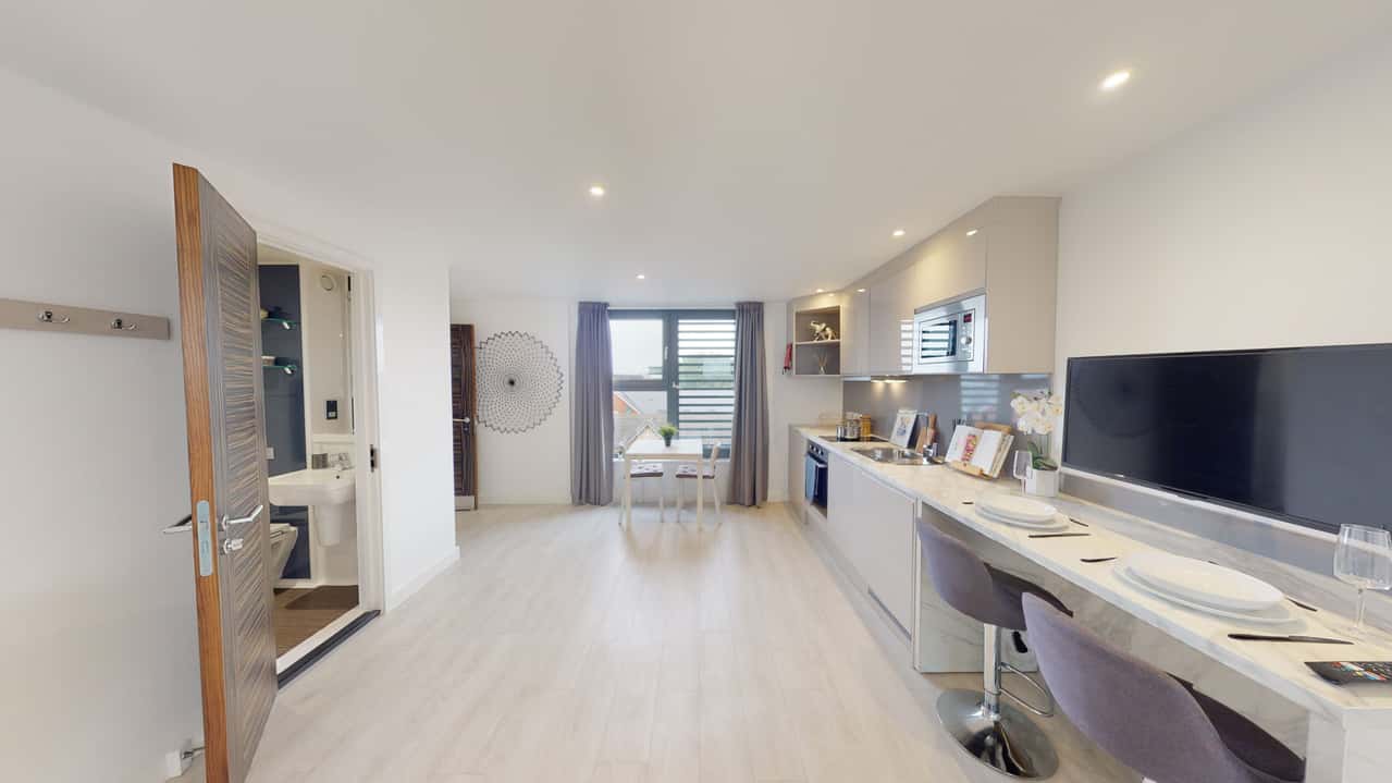 This super deluxe studio measuring around 30-35m² comes with a double size bed with memory foam mattress, under bed storage, bedside table, sliding mirrored wardrobe and drawers, 32” freeview TV, desk with bookcase, drawers & desk chair, black-out curtains, reading lights, breakfast bar with dining chairs, USB ports and a contemporary sofa to relax in.