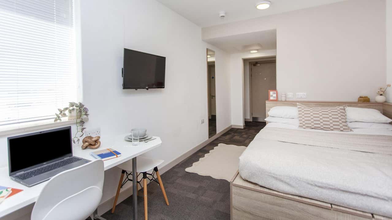 The Superior Plus Studio is a private, self-contained space with a double bed and ensuite bathroom. The kitchen includes a 2-ring hob, combination microwave, and fridge with freezer compartment, giving you everything you need to cook at your own pace. A large desk and chair help keep your study area focused, while the noticeboard, full-length mirror, wardrobe, and 32" flat screen TV bring extra comfort and convenience to your everyday routine. Book your Superior Plus Studio now.