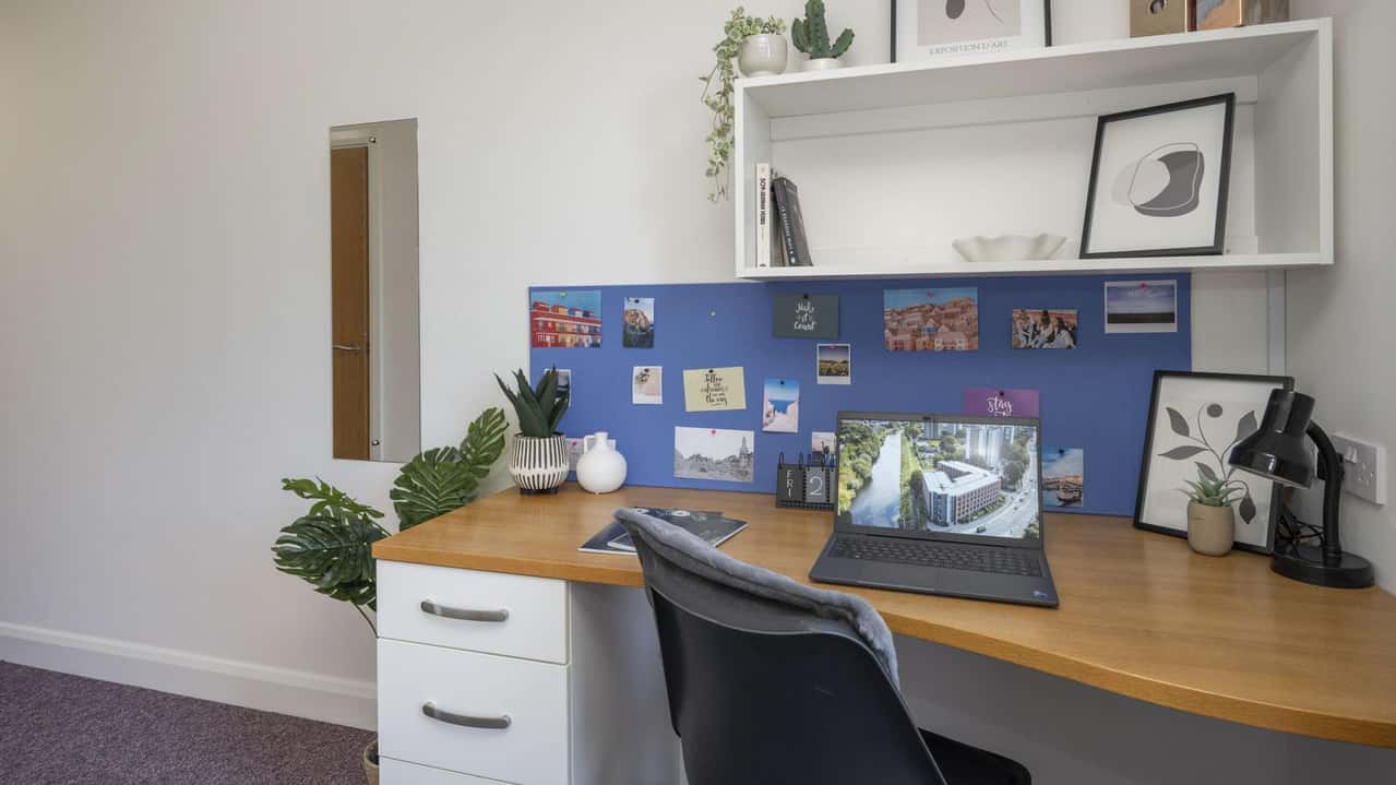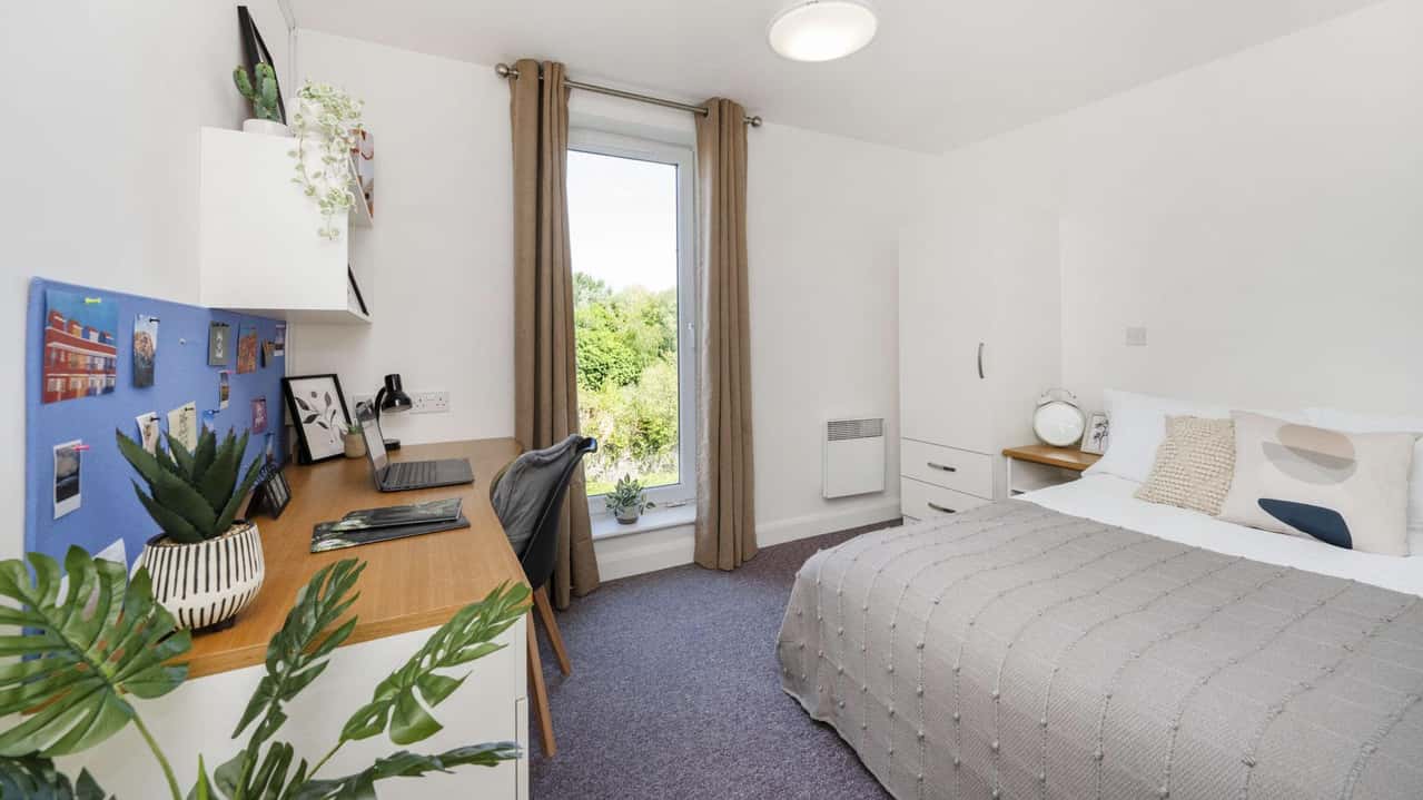 Thoughtfully designed for accessibility and comfort, the Premium Ensuite with Wet Room provides a spacious and practical living environment for students. This room features a double bed with under-bed storage, headboard storage, and a USB charging point, offering both cosiness and functionality. A double wardrobe, full-length mirror, and study desk with drawer space and chair ensure plenty of space for organisation and study. The accessible en-suite bathroom, complete with a shower and WC, provides privacy and ease of use. The shared kitchen is well-equipped with an integrated fridge with freezer compartment, microwave, 4-ring electric hob, fan oven & grill, plus a dining table with chairs and a cosy sofa area, perfect for socialising. Secure your Premium Ensuite with Wet Room today for a premium student living experience!