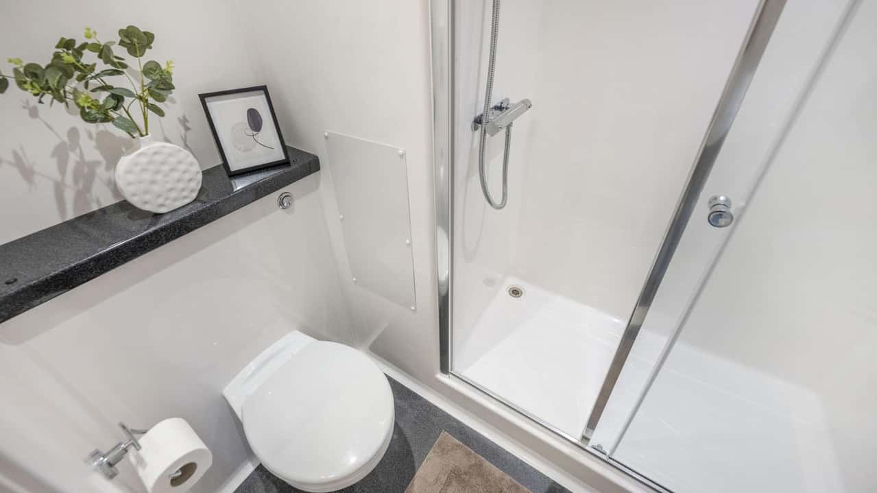 Our Classic En-suite room , sizing around 12.88m² to 17.38m², is designed for students who want a blend of privacy and functionality. It features a double bed with under-bed storage, headboard storage and a USB charging point for convenience. You’ll have plenty of space with a double wardrobe, full-length mirror, and a study desk with drawer space and chair to help you stay focused. The en-suite bathroom with a shower and WC ensures privacy and ease. The shared kitchen is equipped with an integrated fridge with freezer compartment, microwave, 4-ring electric hob, fan oven & grill, a shared dining table with chairs, and a sofa area for socialising. Don’t miss out, book your Classic En-suite today!