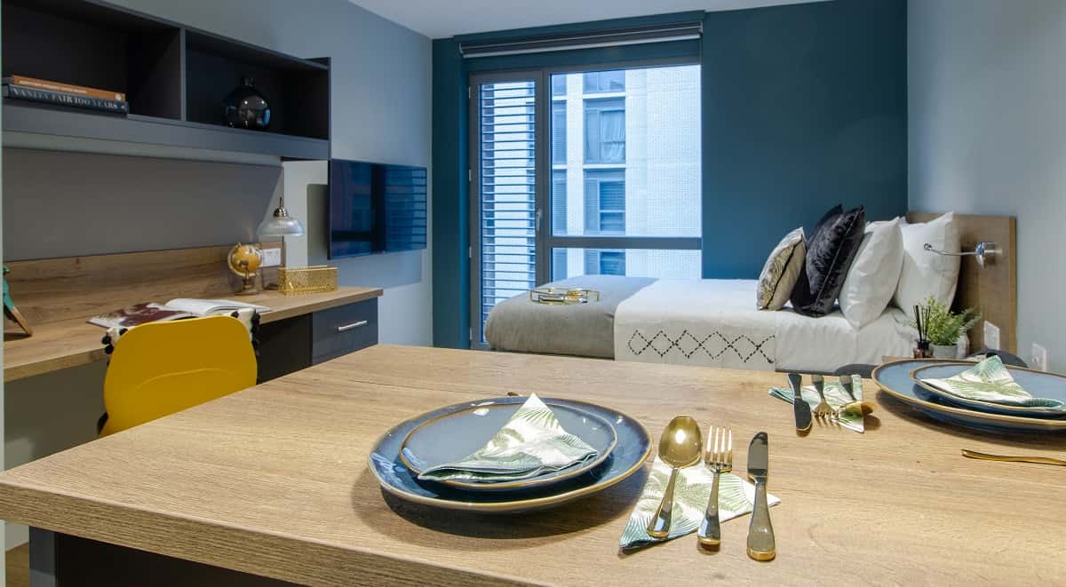 At 20m², these luxury student studio apartments come with a ¾ size bed, bedside table, desk with USB sockets & chair, a wardrobe, drawers, a pin board, and a fitted kitchen area with combi oven, fridge/freezer and 2-ring hob. These studios also come equipped with a 32” TV, breakfast bar and en-suite with shower. Residents also have access to all our incredible exclusive amenities, like the cinema, gaming booths and private fitness suite!