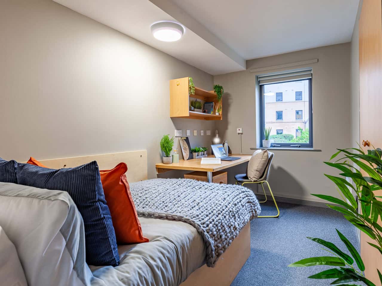 Our Classic Ensuite rooms are the perfect abode for students looking to relax and socialise with others at university. Live in flats of 5-8 people and enjoy sharing social spaces such as the kitchen and living area with friends. Your private room is modernly designed with lots of space, giving you the zen feeling away from the stress of uni life. Featuring a ¾ sized bed, shelving, desk area and an ensuite bathroom, your room is equipped with everything you could need for a comfortable stay.