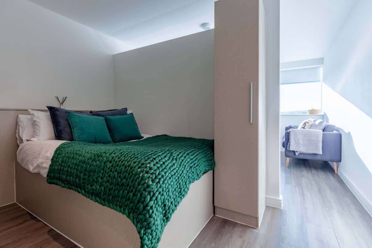 Bigger than our Silver Studios, our Gold Studios are designed with you in mind. Your self-contained apartment includes your own double bed, en-suite bathroom, as well as a modern kitchen and living space. When you have friends over, they can chill on your sofa or sit at the breakfast bar and enjoy a drink. Show off the amazing communal spaces at Redvers Tower including a cinema room, common room, gym, study room. You’ll love your student flat when you go Gold! **Double Occupancy is available for an extra charge. Book now for the next academic year! Layouts may vary.