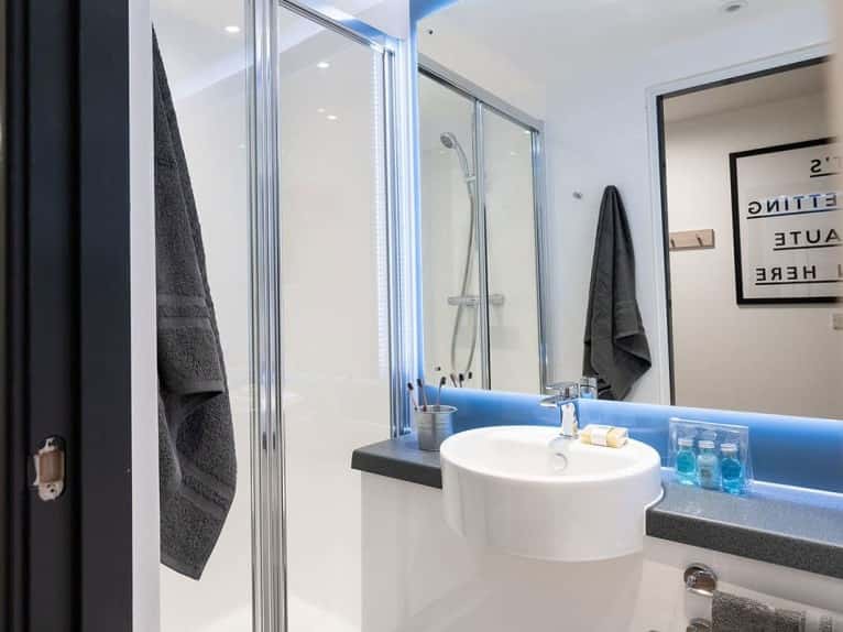 Located on the Lower ground and Ground floor, our Bronze en-suite rooms are designed to provide everything you need for a comfortable student life. Spanning 13 – 14.5 sqm, each room features a cosy small double bed, ample storage, a dedicated study area, and a private en suite bathroom with shower. In this setup, you’ll be part of a welcoming apartment shared with 4 to 9 other students , offering a social atmosphere around a shared living space. In a 5 or 6-bed apartment, you will share a communal kitchen featuring a fridge, freezer, oven, hob, and sink. In 8-10 bed apartments, your communal kitchen will have 2 of each of these amenities. Book your room today!