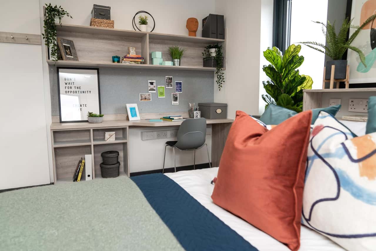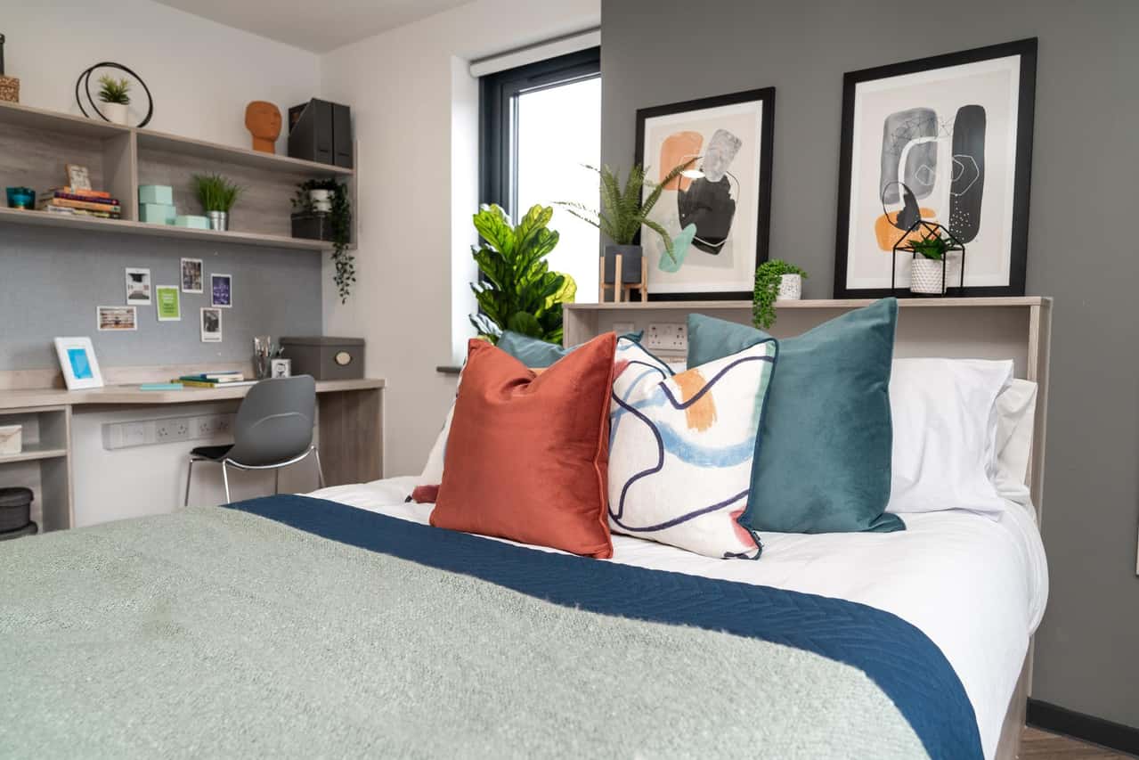 Elevate your student living experience with our Gold en-suite rooms. Located on floors 9 to 12, these rooms provide a spacious 13 – 14.5 sqm of carefully designed comfort, including a small double bed, generous storage, a dedicated study area, and your very own private en suite bathroom with shower. Positioned on the higher floors, these rooms offer stunning views that add to the luxurious ambiance. In a 5-bed apartment, you will share a communal kitchen featuring a fridge, freezer, oven, hob, and sink. In a 7-bed apartment, your communal kitchen will have 2 of each of these amenities. Choose the Gold en-suite and experience the perfect balance of privacy, community, and sophistication.