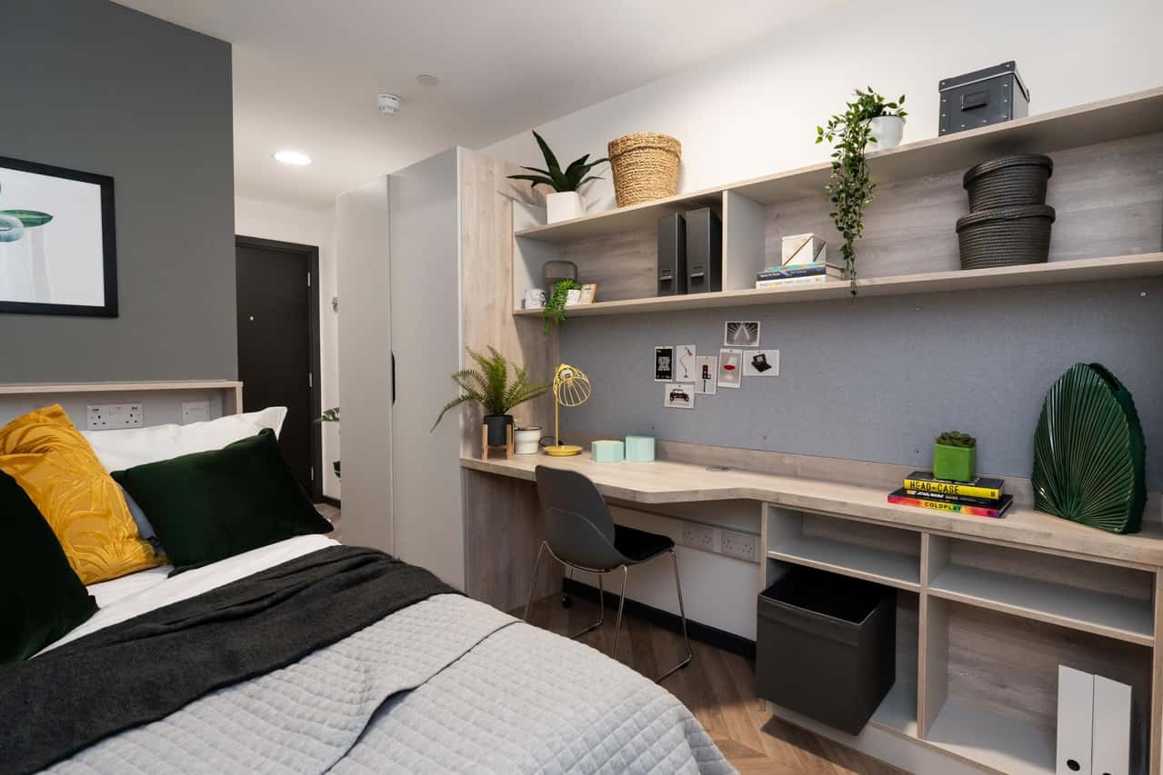 The Deluxe Plus en-suite rooms, spanning up to 18.5 sqm, offer a comfortable layout and are located between the ground and the 5th floor. These rooms are part of a 5-bedroom apartment, where you’ll share a kitchen and lounge with 4 others. The communal kitchen includes a fridge, freezer, oven, hob, and sink, providing a relaxed and social environment. With its larger floor plan and thoughtful amenities, the Deluxe Plus en-suite offers a premium experience for students looking to enjoy student life to the fullest.