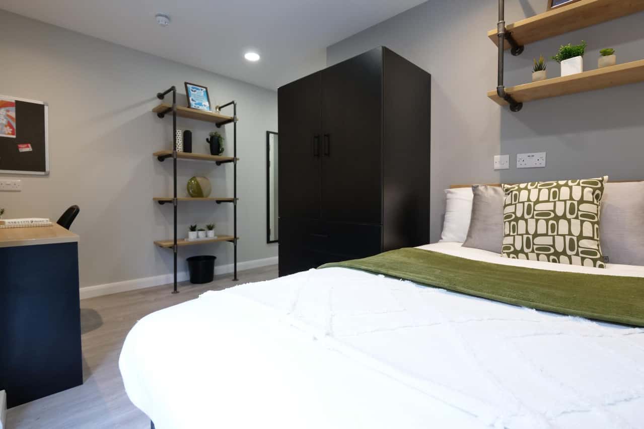 The room offers a range of amenities, including varying sizes from 13m2 to 22.70m2, standard double sized bed with under bed storage, an en-suite bathroom with a shower and WC, a full-length mirror, pinboard, study desk with drawer space and chair, and a wardrobe. In the shared kitchen, you can find a 4-ring hob with extractor, an electric oven, a full-size fridge freezer, and a shared dining table with chairs.