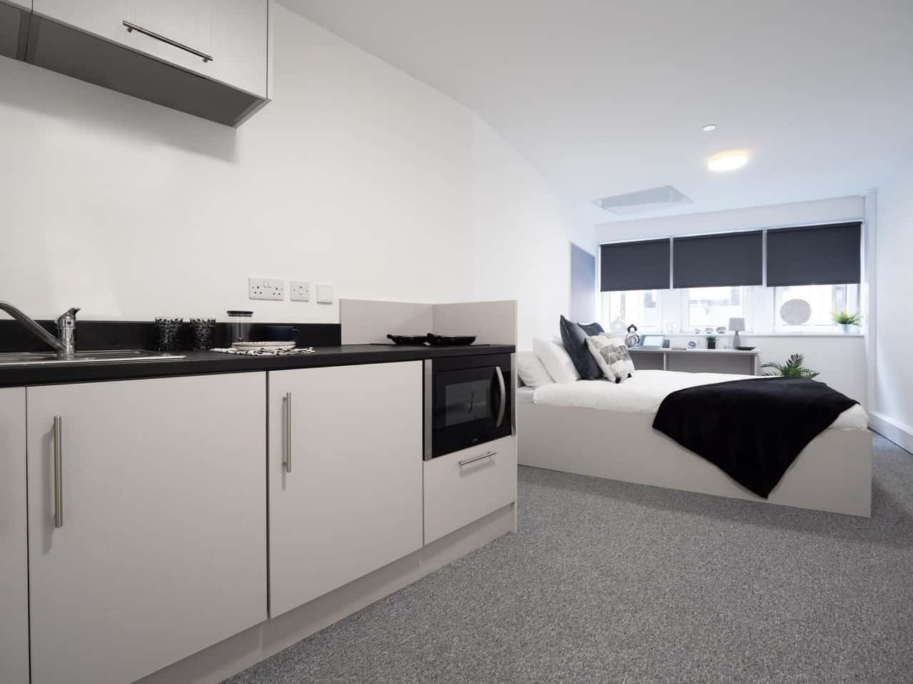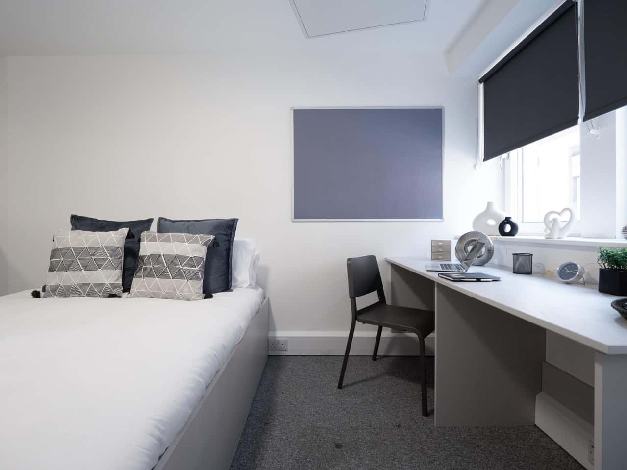 Experience comfy student living in our Silver Studio available in sizes ranging from 23sqm to 24sqm. You'll have a double bed with under-bed storage, an integrated wardrobe with drawers, a desk with a chair, and your very own private en-suite bathroom. Plus, there's a private kitchen with all the amenities like a fridge, oven, hob, and cupboards where you can cook your favourite dishes.