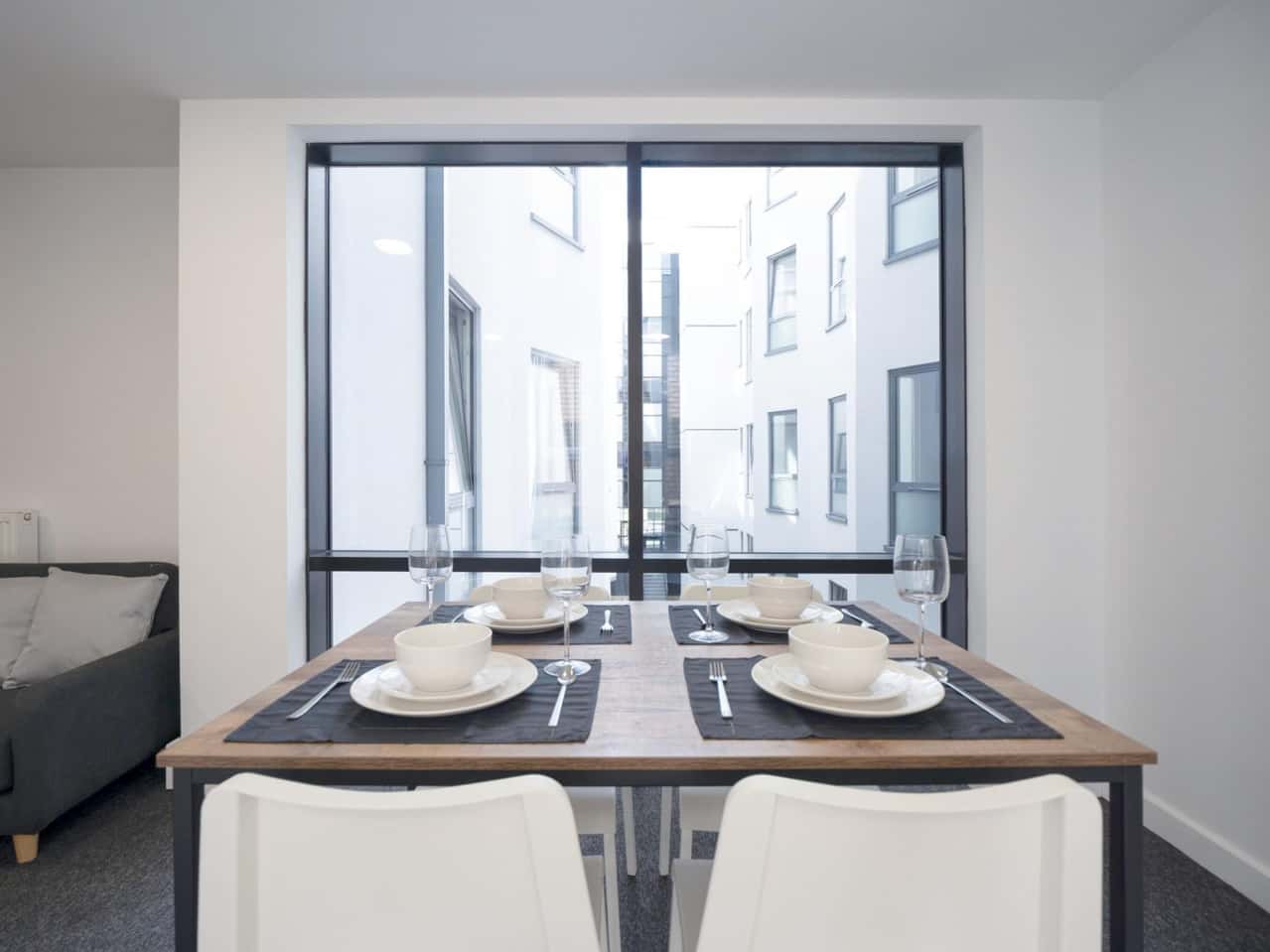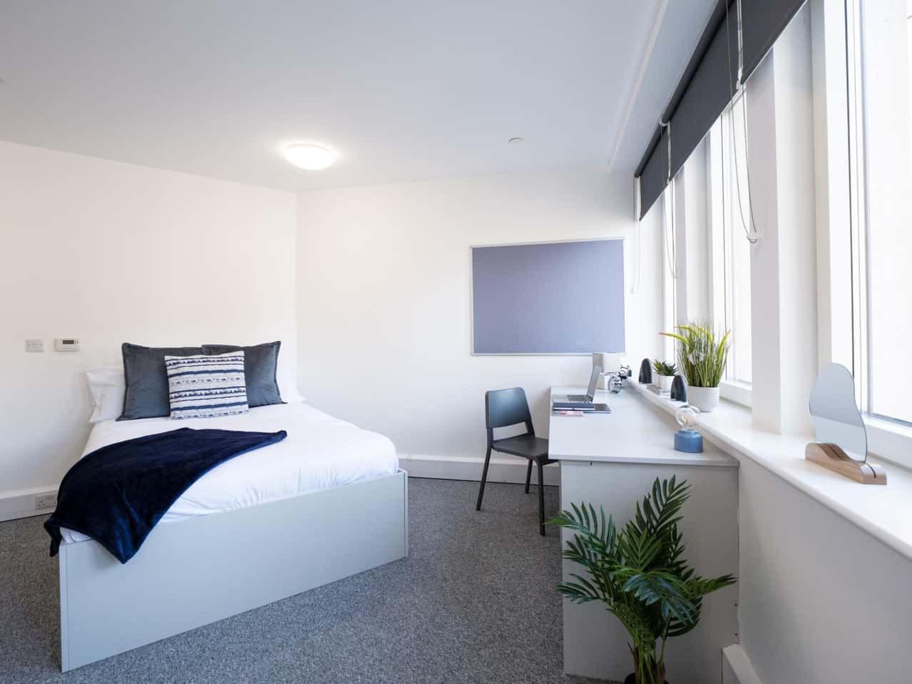 Our Gold Ensuite offers spacious living for students, with a room size range of 18sqm to 20sqm. You'll have a double bed with under bed storage, an integrated wardrobe with drawers, shelves for your belongings, and a desk with a chair. Your private en-suite bathroom ensures comfort, and the shared communal kitchen with all the amenities like a fridge, oven, hob, and cupboards is perfect for when you want to cook your favourite meal. The lounge area with sofas and tables provides opportunities to bond with housemates.