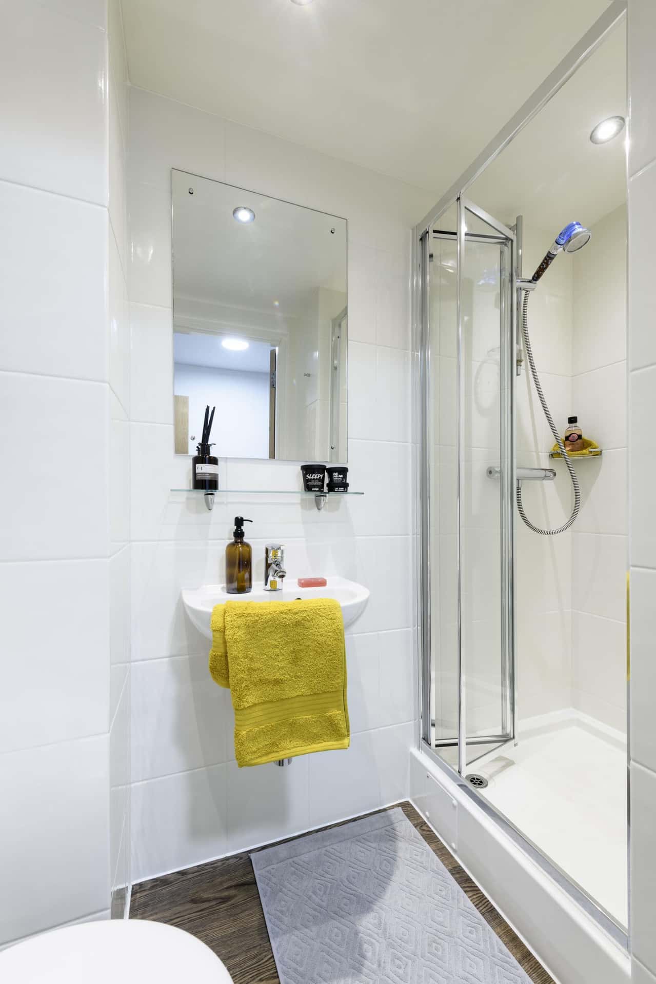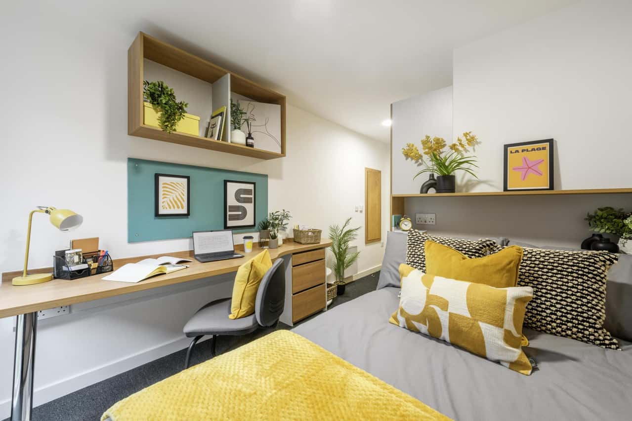 The Gold Ensuite can be found on fourth, fifth, sixth and seventh floors and offers the perfect mix of comfort and community living. Step into a cosy room with a comfortable bed, ample storage space for your belongings, and a dedicated desk area to keep you focused and organised for your studies. Enjoy the convenience of your own en-suite bathroom, giving you privacy and ease every day. You’ll also have access to a shared kitchen equipped with microwave, kettle, toaster, induction hob, oven, TV, fridge —ideal for cooking up meals and socialising with your flatmates. Ready to experience comfortable living? Book your Gold Ensuite today!