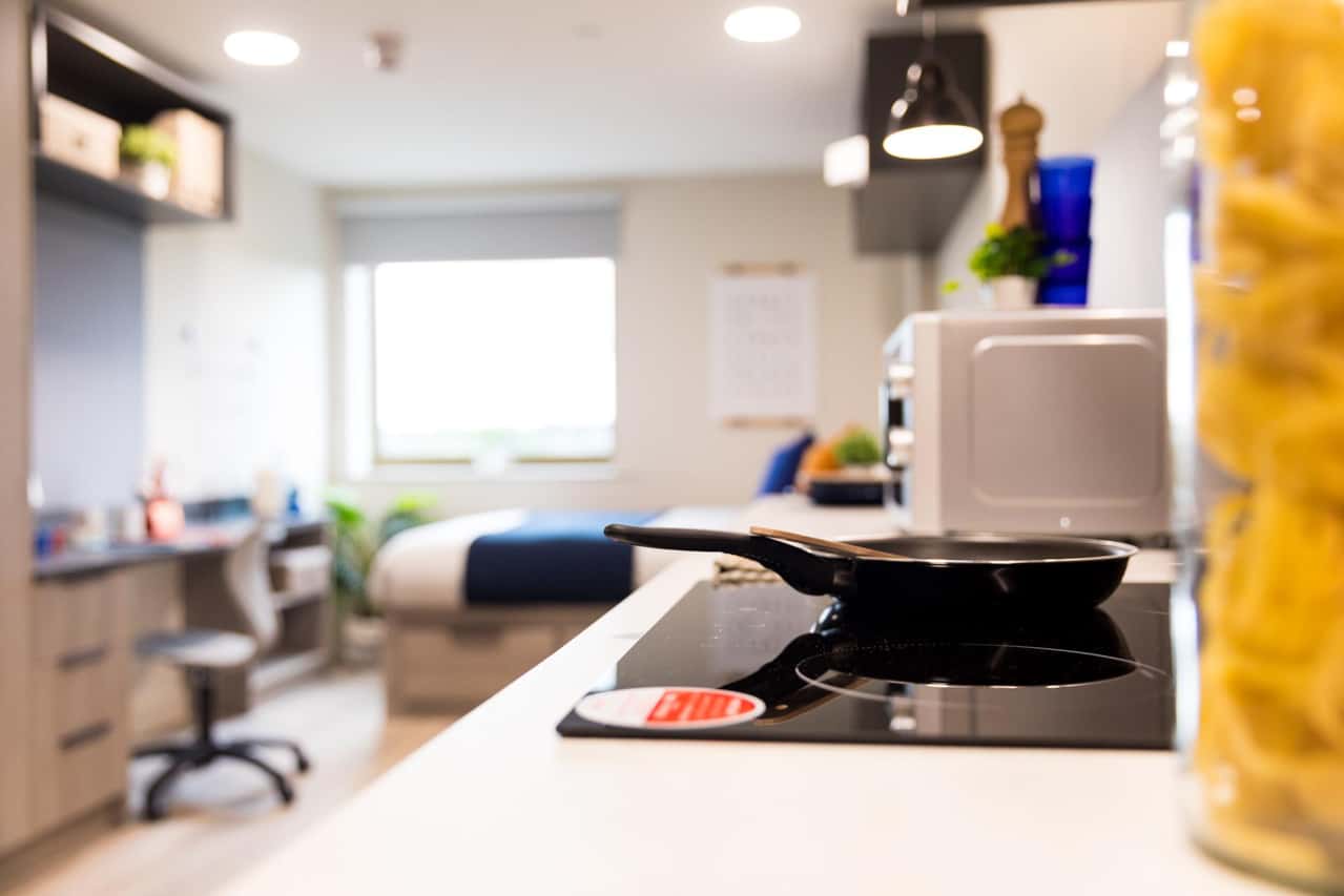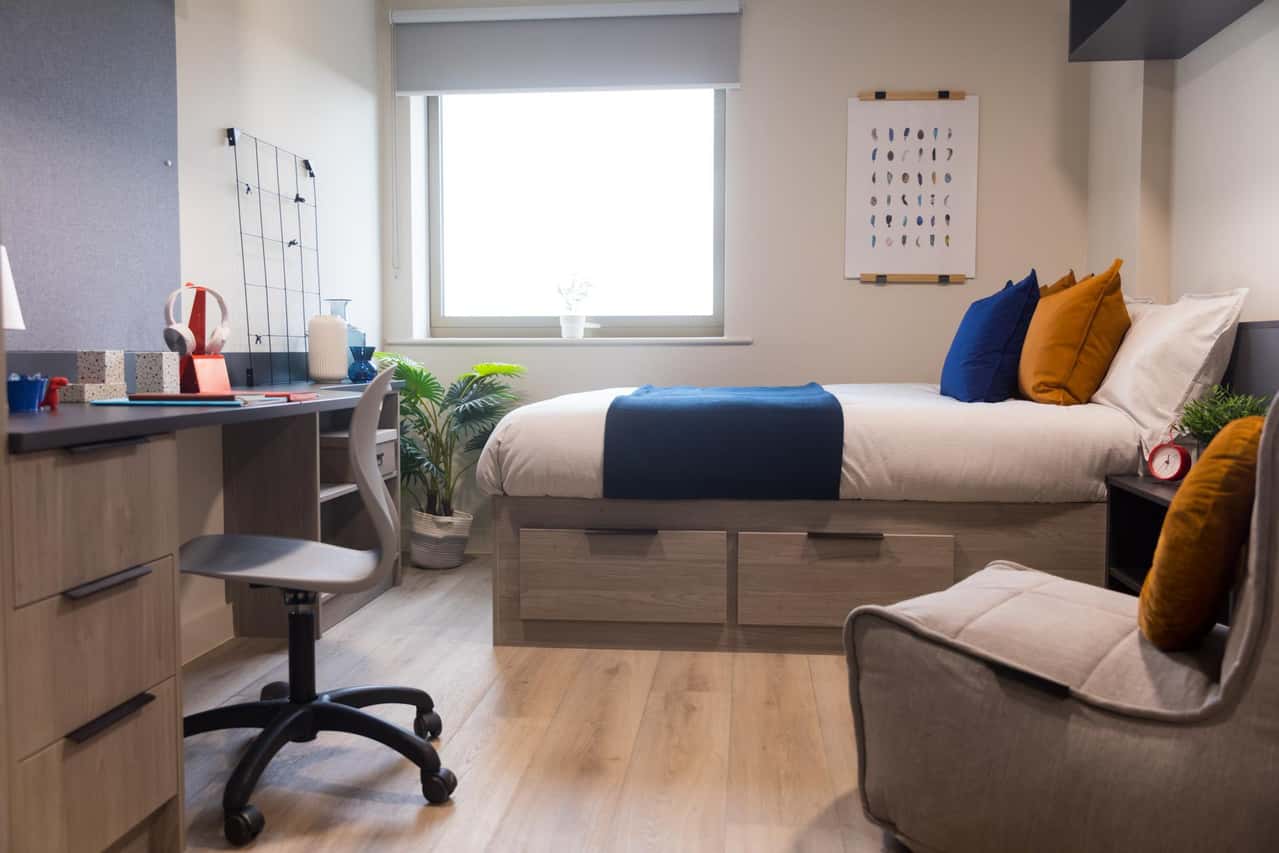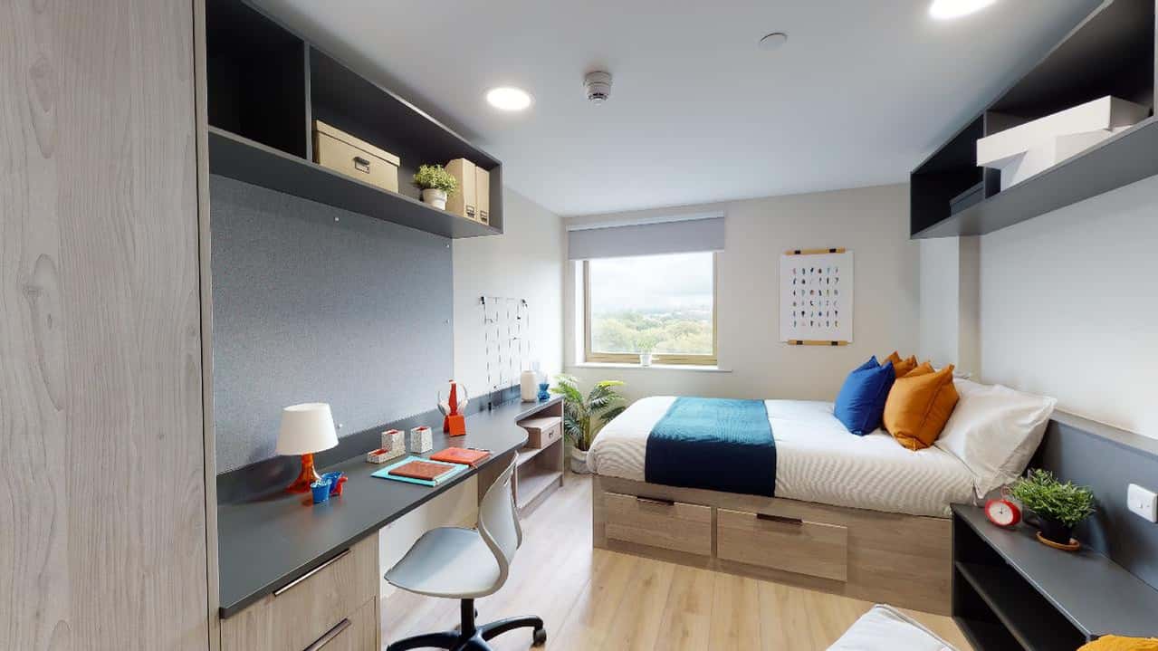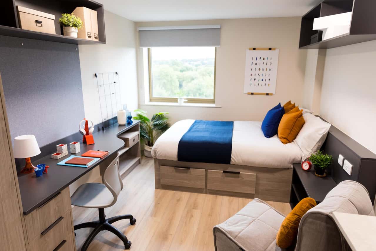 Our Premium Studio measures between 19.3m2-20m2 and comes fully furnished with a small double bed with under bed storage so you can take all the long naps you could want and a private en-suite shower room for relaxing after a busy day. For cooking up some new recipes, your private kitchen has everything you could need, including a breakfast bar dining space. If you’ve got some studying to do, you can focus at your study desk with your own chair. If you want to meet other students living here, our communal lounge, cinema room and games room are perfect. Book now!