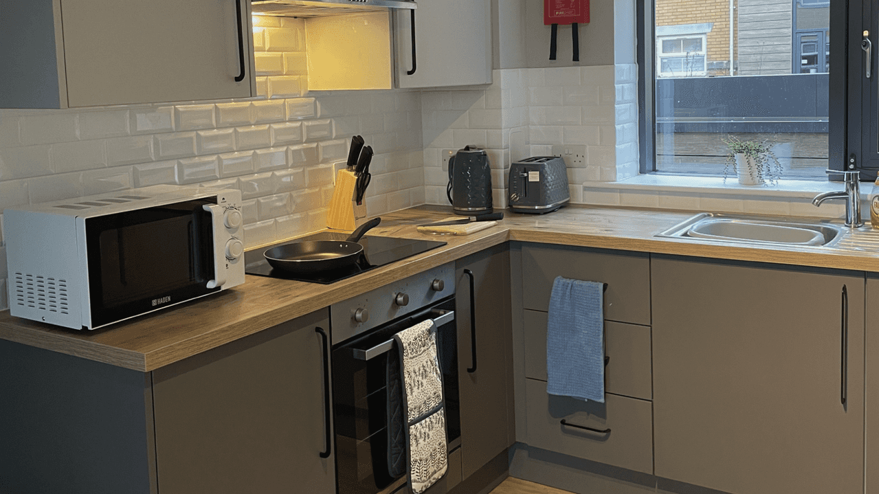 Our Classic 4 Bed Apartments offer a private bedroom with a comfy 3/4 bed with underneath storage as well as fast Wi-Fi speeds to utilise when sitting at your very own study desk and completing uni work. This room style offers students a sociable living space with a large shared kitchen/dining area and bathroom as well. Whilst staying at Emily Davies, you can make the most of great amenities and meet tons of new students in our common areas, cinema space or courtyard area! Make use of our private dining area to host friends or our private study spaces to focus on your work. We’re right on the doorstep of Southampton city centre too so you can explore your new city at ease with busses stopping just a short 2-minute walk away that lead all across the city. Hurry up and book your room today!