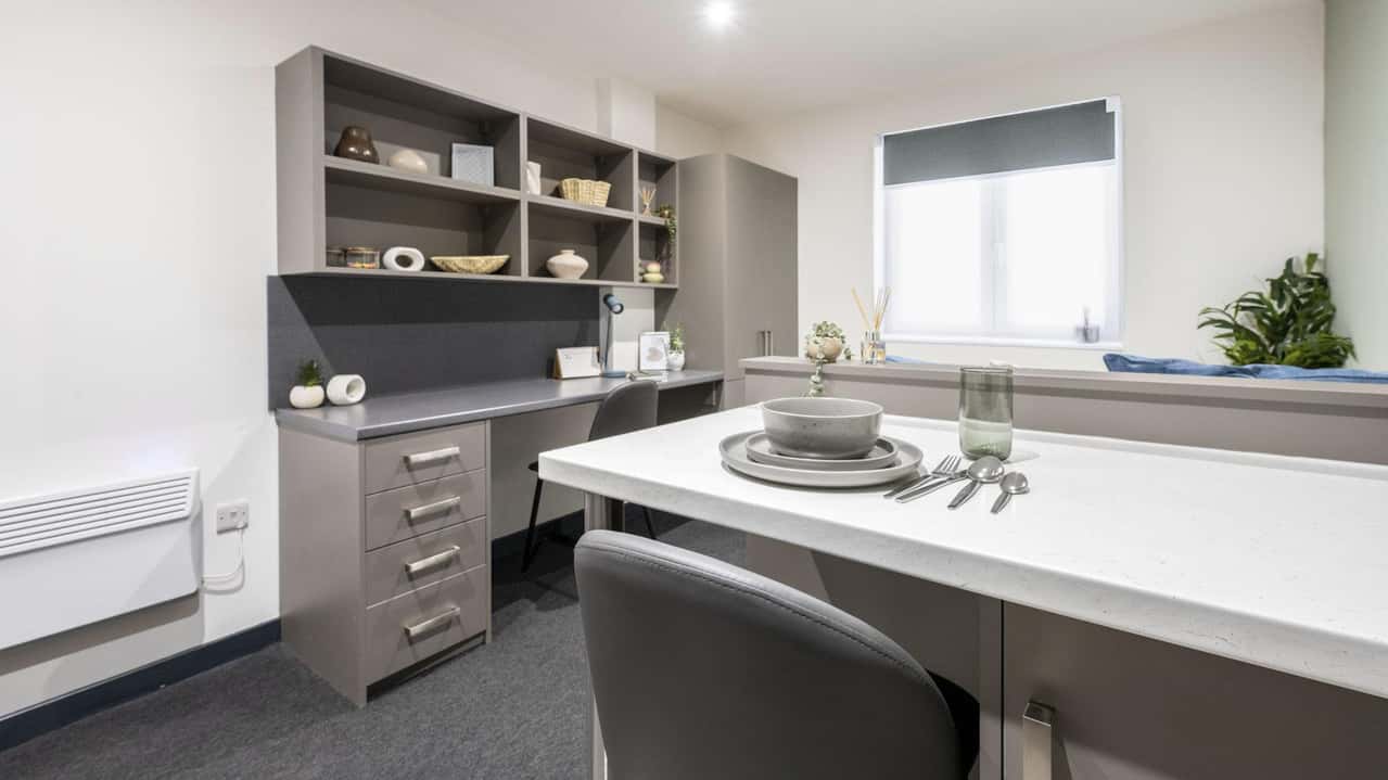 The Bronze Studio, ranging from 17.9 to 19.6 SQM, is the perfect space to settle into student life. Located on floors 1 to 3, this studio offers a comfortable bed, a study desk and chair, and a spacious wardrobe for all your essentials. You’ll have a private en-suite bathroom and a kitchen equipped with all essentials, so cooking at home is easy. With everything within reach, this studio is ideal for students who want comfort and convenience in one space. Book your studio today!