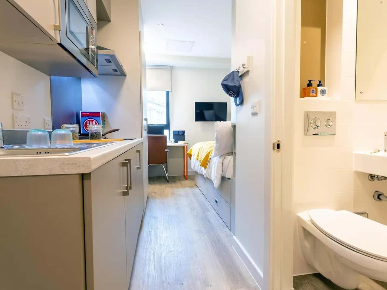 Your Premium Cluster Studio at Seren offers between 12-15 square metres of enhanced self-contained living within an intimate seven-bed flat, where studio independence meets close community connection. This well-equipped space features a ¾ double bed with under bed storage, dedicated study space with desk and chair, wardrobe, and shelves for organisation. Your private kitchen area includes microwave oven, under counter fridge/freezer, 2 ring induction hob, and sink for complete culinary freedom, while the private ensuite shower room is yours alone. Your 32-inch TV and USB sockets ensure entertainment is available, blackout blinds allow for proper rest, and thoughtful touches like coat hooks, peg board, and mirror enhance daily comfort. Access to the communal kitchen and living room offers flexibility to socialise with your six flatmates or enjoy your own space. All utility bills are included, while our impressive Gym supports your wellness and the competitive Snooker Table provides entertainment. At Seren, the Premium Cluster Studio delivers elevated living in a perfectly sized community.