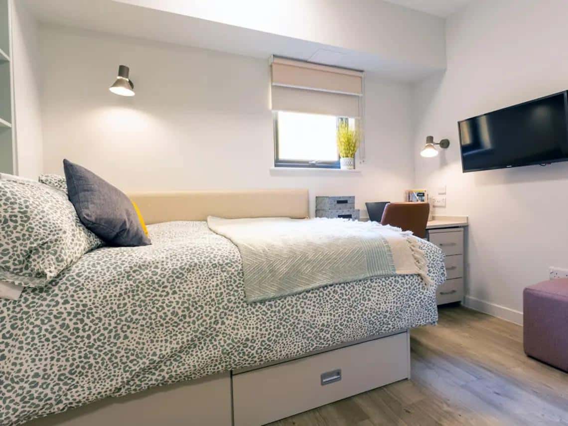 Your Deluxe Studio at Seren provides 23 square metres of generously proportioned self-contained Swansea living, with varied room layouts to suit different preferences - contact our team to find your perfect room. This spacious studio features a ¾ double bed with under bed storage, dedicated study space with desk and chair, wardrobe, and shelves for organisation. Your private kitchen includes induction hob, oven, and fridge freezer for complete culinary independence, while the private ensuite shower room is yours alone. Your 32 inch TV with USB sockets provides entertainment, blackout blinds ensure proper rest, and thoughtful touches like coat hooks, peg board, and mirror enhance daily comfort. The additional square metres make a real difference to daily life, creating room for studying, entertaining, and relaxation without compromise. All utility bills are included, while our impressive Fitness Studio supports your wellness and the spectacular Roof Terrace offers stunning Swansea views. At Seren, the Deluxe Studio delivers exceptional space and quality self-contained living.