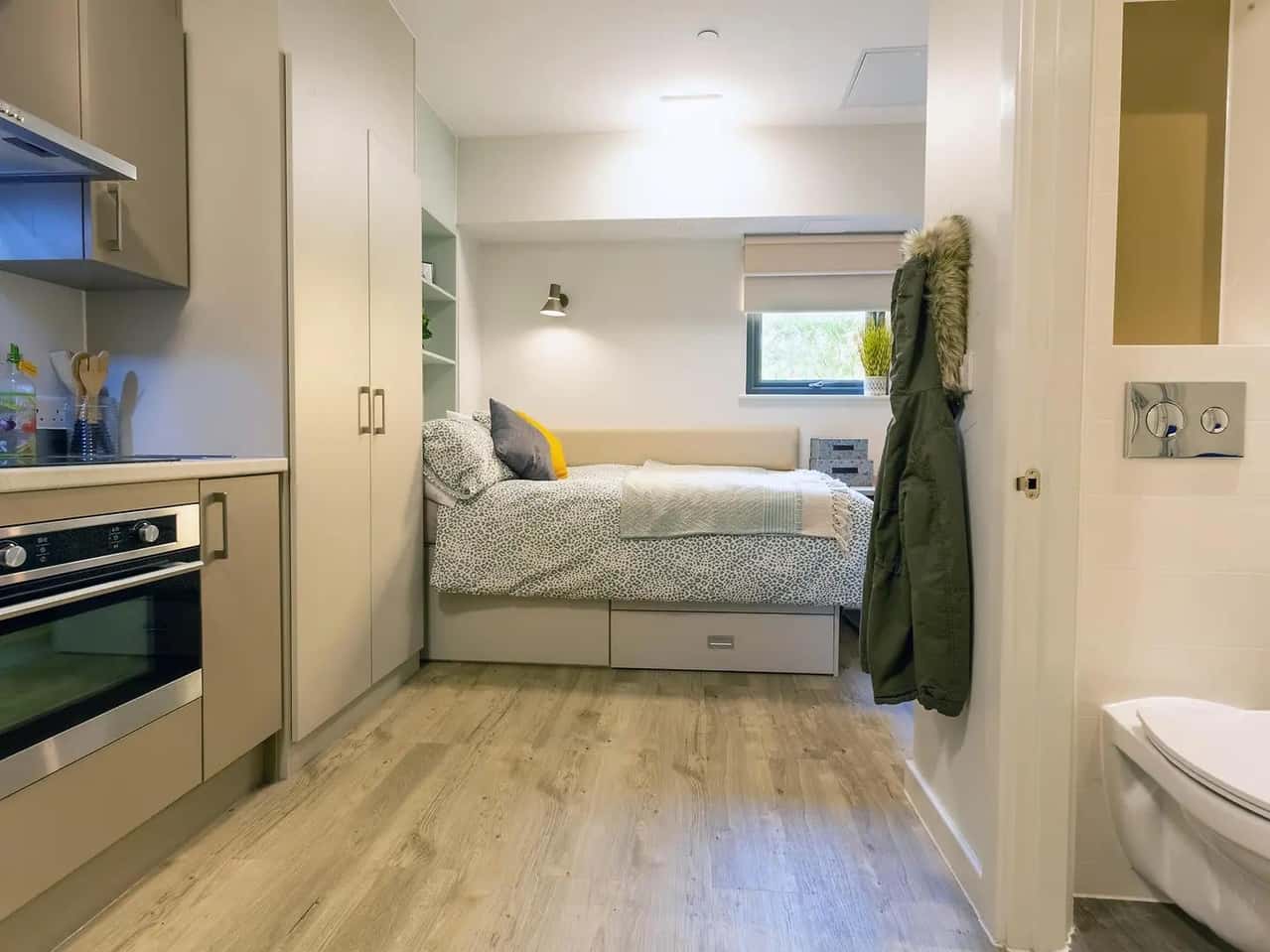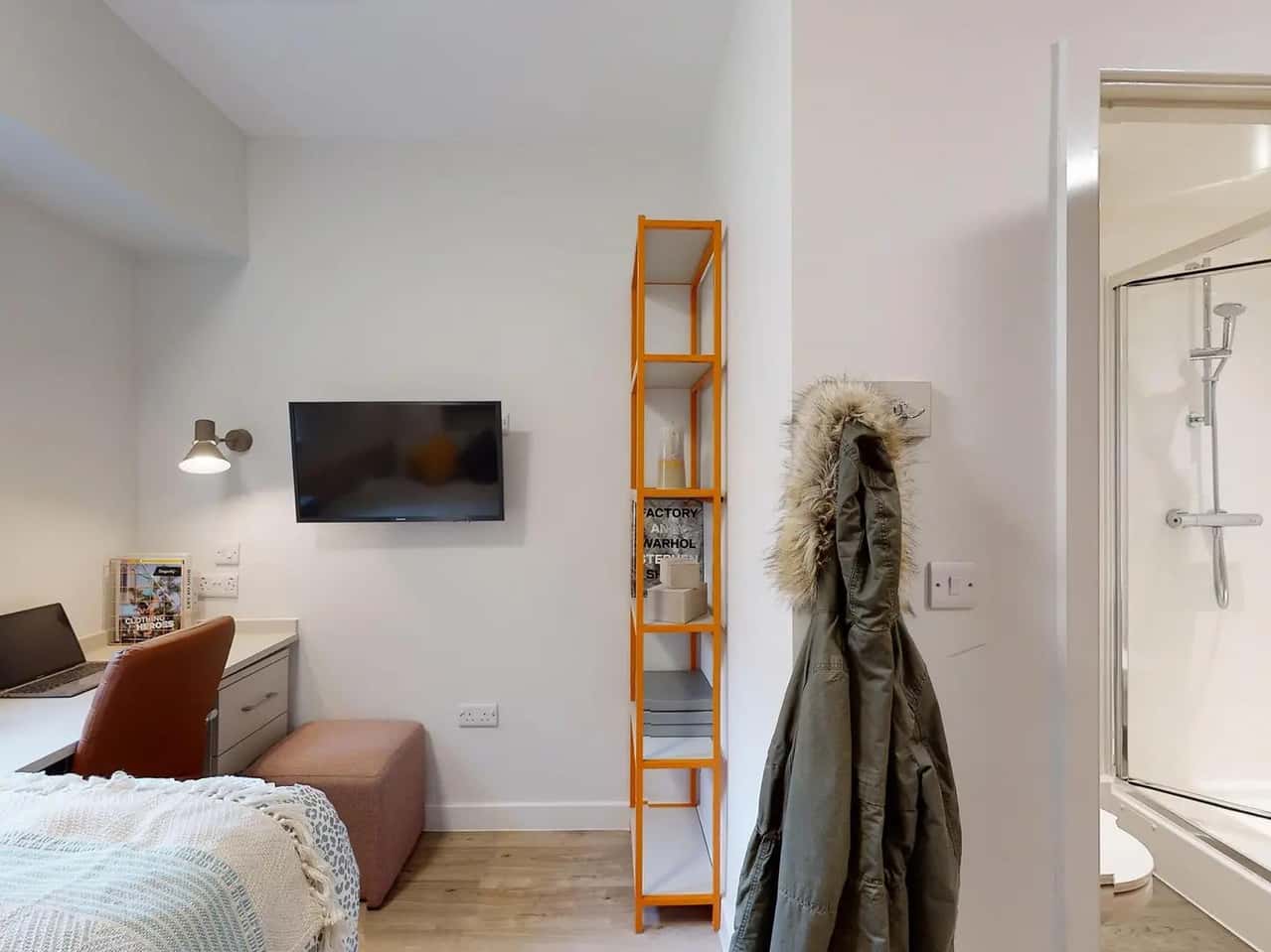 Your Block B Penthouse Studio at Seren occupies the building's two highest floors, offering between 15-17 square metres of elevated self-contained living with exclusive views across Swansea city centre and the bay. This studio features a ¾ double bed with under bed storage, dedicated study space with desk and chair, wardrobe, and shelves for organisation. Your 32-inch TV and USB sockets ensure entertainment is available, while blackout blinds allow for proper rest. The private ensuite shower room is yours alone, and your private kitchenette includes induction hob, microwave, and small fridge with freezer compartment for complete culinary independence. Thoughtful touches like coat hooks, peg board, and mirror enhance daily comfort. The upper floor position delivers quieter living spaces with rooftop views - watch the world go by from your room. All utility bills are included, while our unique BBQ Area provides outdoor entertaining spaces and the impressive Gym supports your wellness. At Seren, the Block B Penthouse Studio delivers exceptional views and elevated living.